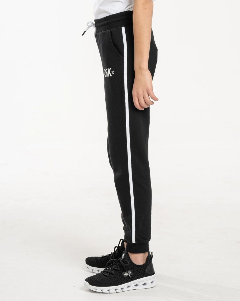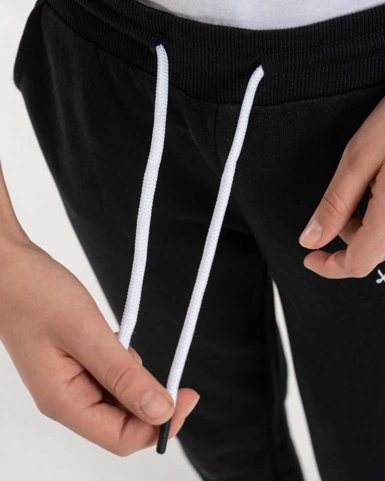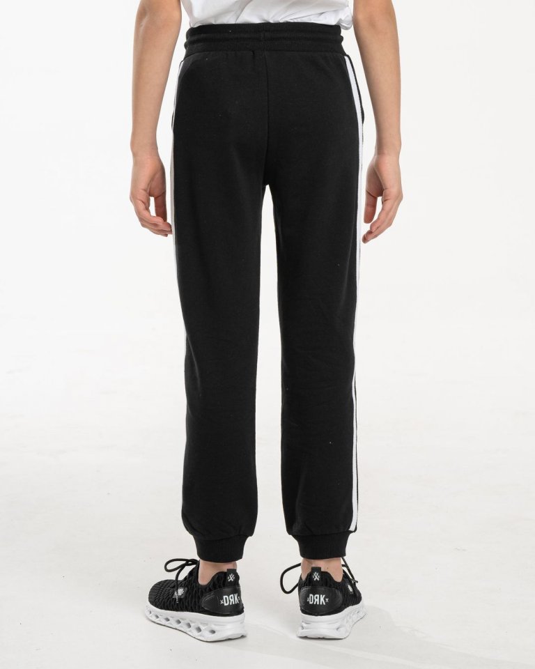 Magas pamuttartalmú divatos gyerek nadrág. Reguláris szabású modell, rugalmas dereka húzózsinórral pontos méretre állítható. Oldalzsebes, szárvégei széles passzés anyagban végződnek. A nadrágot márkajel díszíti. Kitűnő választás szabadiős tevékenységekhez, sportos utcai viseletként.