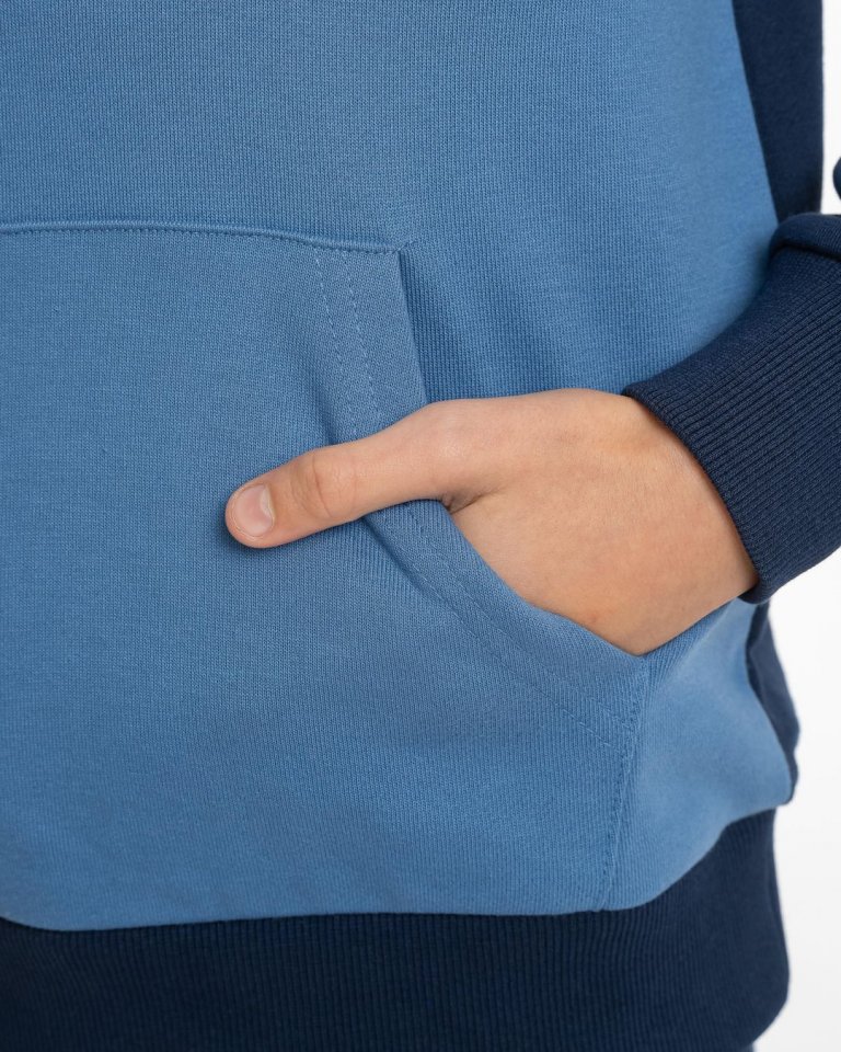 Divatos gyerek pulóver a hűvös napokra. Vagány megjelenésének köszönhetően nagy kedvence a gyerekeknek. Reguláris szabású modell kapucnival, kenguruzsebekkel. Anyagának magas pamuttartalma puha érzést biztosít, míg a poliészter szálak a tartósságról gondoskodnak. A pulóver elejét nagy márkajel díszíti.