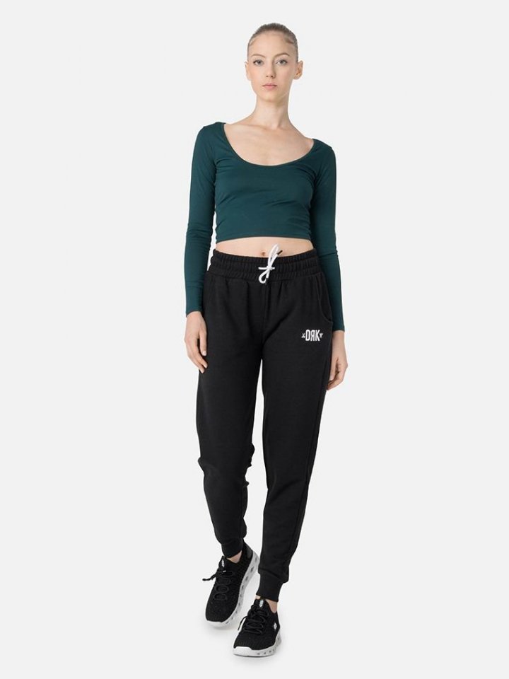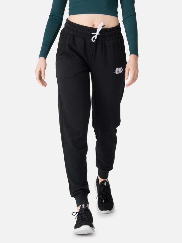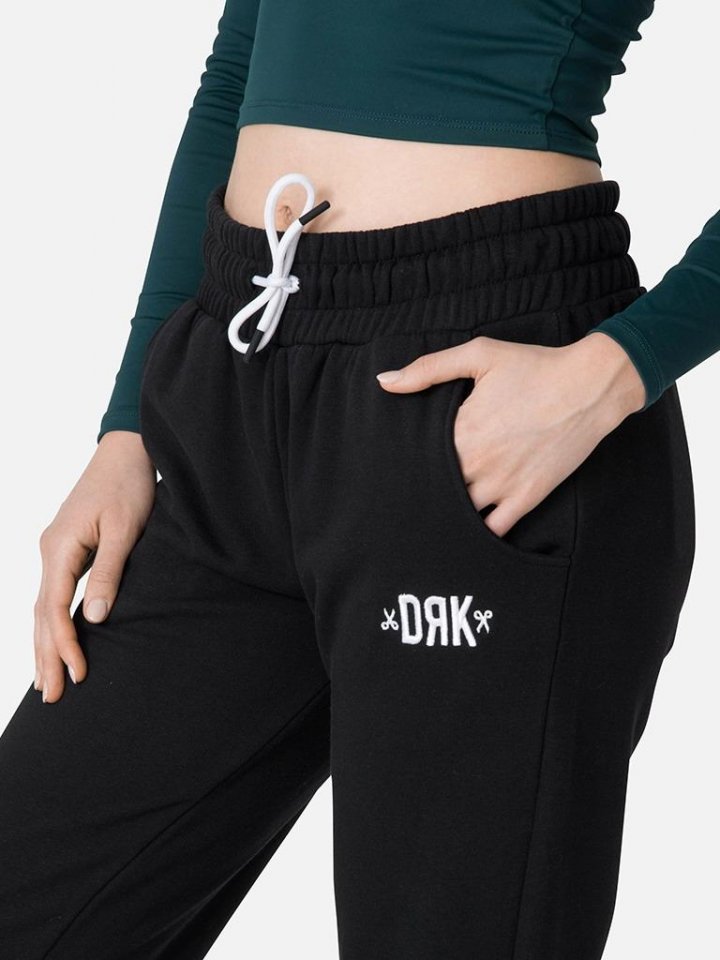 Magas pamuttartalmú divatos női nadrág. Szűkülő szárú, gumis derekú modell. Oldalzsebes, szárvégei széles passzés anyagban végződnek. A nadrágot márkajel díszíti. Kitűnő választás szabadiős tevékenységekhez, sportos utcai viseletként.