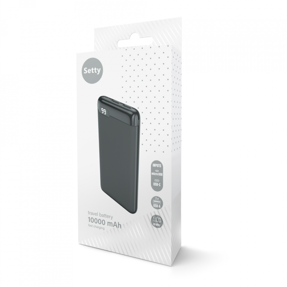 Setty SPBL10 10000mAh Powerbank, LCD Gyors Töltés és LCD Kijelző, Fekete